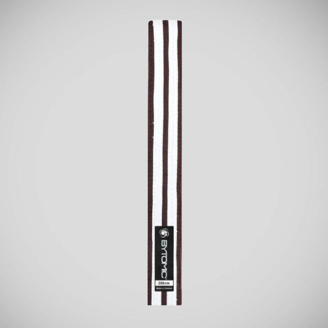 Presenting the powerful Brown/White Bytomic Double Stripe Belt—a need for fighters looking to improve their fighting skills! This amazing belt, which has a solid brown color with two striking black stripes, exudes a powerful blend of simplicity and flair.