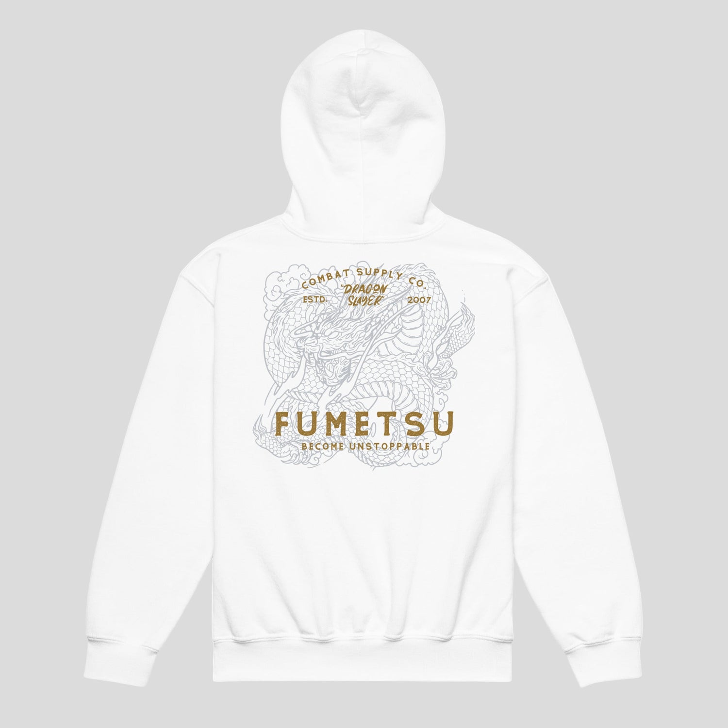 The Fumetsu Dragon Slayer Kids Hoodie White offers comfort and style for young martial artists. Showcasing a bold dragon graphic on the back and a clean logo on the front, it’s ideal for wearing on training days or as casual wear. Made from a soft cotton blend with a classic pouch pocket, it’s designed to be both functional and eye-catching.